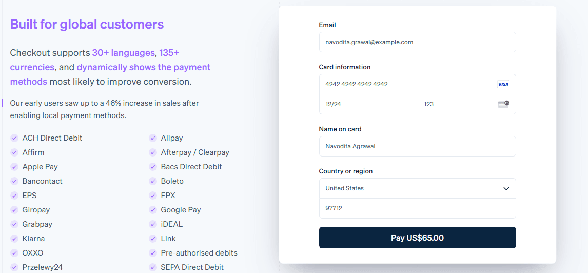 Stripe offers a comprehensive suite of payment processing tools designed to accommodate businesses of all sizes—from startups to large enterprises. The platform supports direct payments in over 135 currencies, as well as alternative payment methods, including Alipay, Apple Pay, and Google Pay. This flexibility makes Stripe a global partner capable of handling complex payment needs.